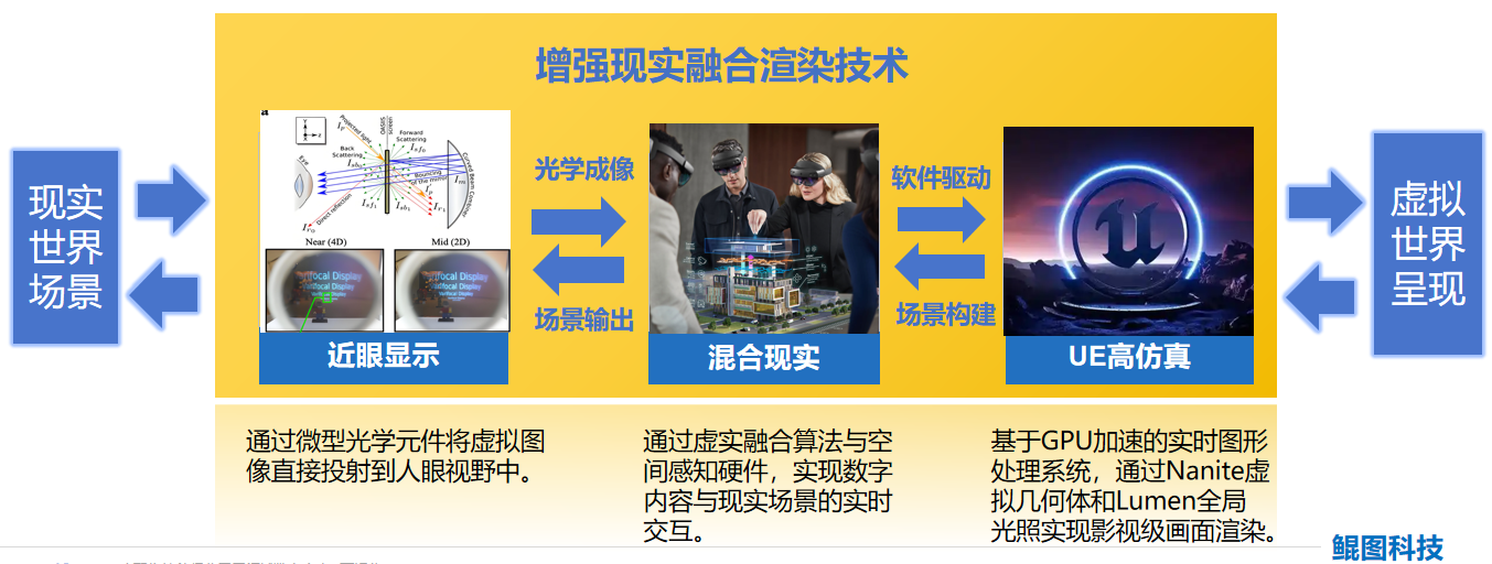 现实世界场景 → 近眼显示 → 混合现实(光学成像、场景输出)→ UE 高仿真(软件驱动、场景构建)→ 虚拟世界呈现